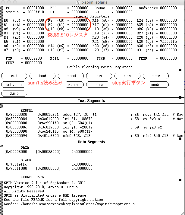 プログラムの実行には二つの方法があり、stepボタンによる実行では、テキストセグメントの命令が一命令ずつ実行されます。 一方runボタンを使うと、プログラムを一度に実行できます。