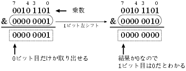 この様にして各ビットが1か0かを調べられます。