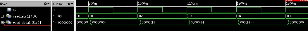 これを参考にして、以下のテーブルに示すように、レジスタに値の値を書き込んで、読み出すテストベンチを作成し実行したうえで、クロック信号(ck)、読み出しているレジスタのアドレス(read_adr1)と読み出し結果(read_data1)の波形を確認しなさい。波形には、この三つの信号のみを表示すること。表示する順番は、小さいアドレスから大きいアドレスになるようにすること。なお、表示している信号名がわかるようにすること。